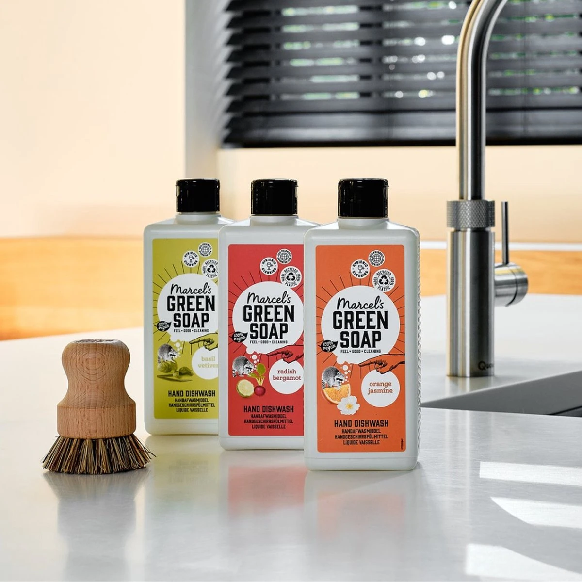 Marcel’s Green Soap afwasmiddel basilicum & vetiver is gemaakt van plantaardige zepen, vegan, minstens 97% biologisch afbreekbaar en komt in een fles van 100% gerecycled plastic. Duurzaam afwasmiddel marcel’s green soap afwasmiddel is gemaakt van plantaardige zepen en dus vriendelijk voor het milieu, je huis én je lichaam. Verrijkt met essentiële olie van basilicum en vetiver gras en een heerlijk natuurlijk basilicum & vetiver parfum, zodat afwassen (we durven het bijna niet te zeggen) een echte ‘geurbeleving’ wordt. En terwijl je wordt opgeslokt door die intense ervaring wordt de huid van je handen gelijk lekker verzorgd door het zachte schuim en de verrijkende ingrediënten. Het doen van de afwas was nog nooit zo ontspannen! tenzij je de vaatwasser aan het werk zet natuurlijk. Gelukkig heeft marcel ook ecologische vaatwastabletten ontwikkeld! bomvol natuurlijke ingrediënten zoals alle producten van marcel’s green soap bevat ons afwasmiddel geen kleurstoffen, parabenen, fosfaten, chloor, ammonia of zuren. Sterker nog, het afwasmiddel zit bomvol natuurlijke ingrediënten en is minstens 97% biologisch afbreekbaar. Basilicum & vetiver het frisse en kruidige van basilicum gecombineerd met de elegante en aardse geur van vetiver gras: frisser wordt het niet! leuk detail: volgens de italianen geeft basilicum je vertrouwen en energie. Oppassen dus, want als je eenmaal begint met schoonmaken…