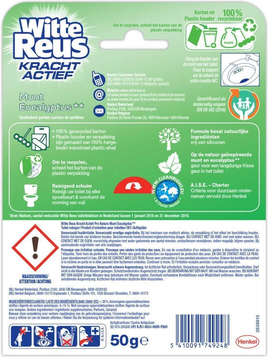 Witte Reus Kracht Actief Pro Nature Munt Eucalyptus wcblok zorgt voor een schoon en fris toilet door middel van natuurlijke ingrediënten. Het is een duurzame en handige manier om te zorgen voor een schoon toilet van de eerste tot de laatste spoelbeurt.